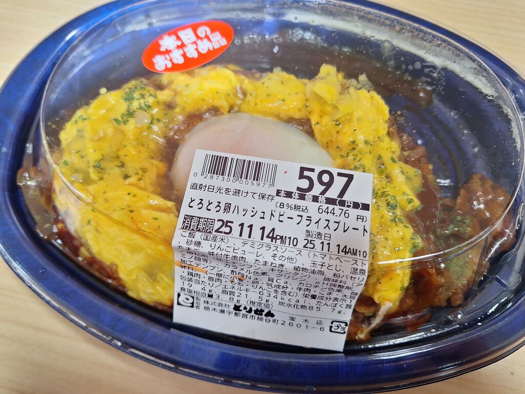 鹿沼にはないので(>_<)近くに行った際に覗きました☆自分のお昼は“5種果実の旨だれ牛カルビ重”に即決~なんと398円+税!夕飯は、広告の品の“めちゃ旨!タルタルチキン南蛮”497円+税をチョイス♪チョコバナナが半額だったので、子どものおやつにGET。翌日が賞味期限のものも14時で結構割り引きになっていたので、フードロス削減でお値下げが早めなのかなぁと嬉しく感じました(^ー^) (訪問:2025/02/27)