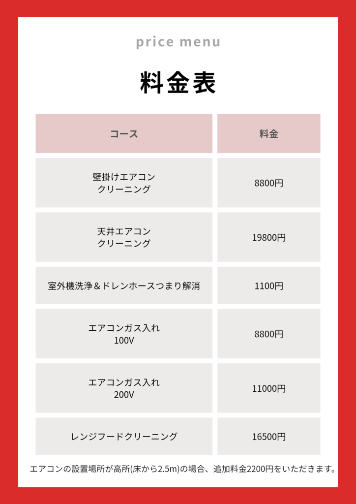 〇壁掛けエアコンクリーニング1台 8800円。 〇天井エアコンクリーニング1台 19800円。 〇室外機洗浄&ドレンホース点検 1100円。 〇キッチンレンジフードクリーニン1台 16500円。 |