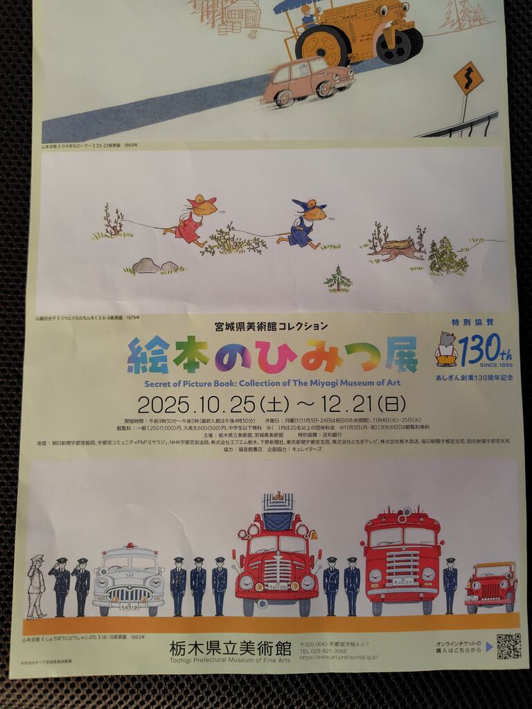 宮城県美術館コレクション 絵本のひみつ展へ行って来ました。M割(ミュージアム割引)を利用して チケットは1250円のところ1000円に。何と言っても嬉しかったのは、絵本の原画を実際に見ることが出来たからです。ぐりぐらの 山脇百合子。中谷千代子。長新太。田島征三等。心うきうきの気分を味わいました。車椅子を利用されているお嬢さん達がおられ、共に同じ絵を味わうことが出来て 更に嬉しい気持ちになりました。常設展も見て、2階へ階段で上がったら 丁度銀杏の木が黄色に染まって 作品のように美しかったです。 (訪問:2025/11/24)
