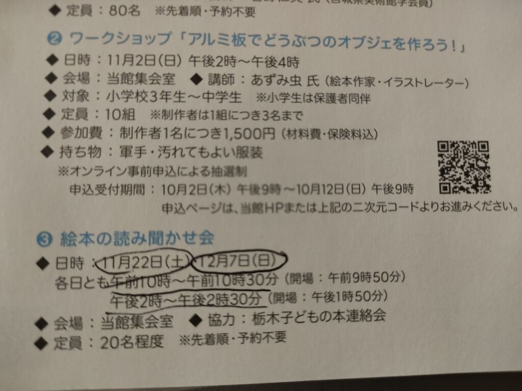 午後の昼下がりに娘と一緒に絵本のひみつ展へ行ってきました。ちょうど14時〜の絵本の読み聞かせにも間に合い5冊ほどの絵本を、途中に手遊びを交えながらゆったりと童心にかえり楽しませて頂きました。また次回は12月7日(日)にあるそうです。終わった後は絵本の絵を間近で見ることができて手描きの尊さや温かみをじんわり感じておりましたが娘が美術館の隣にある公園で遊びたくなりまた後日にゆっくり見ることに。公園も程よく広く美術館の帰りにピッタリでした。親子共に楽しい時間を過ごせました^_^ (訪問:2025/11/22)