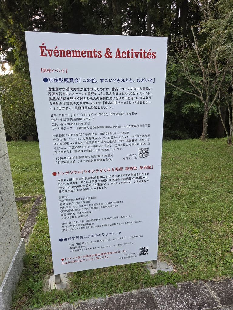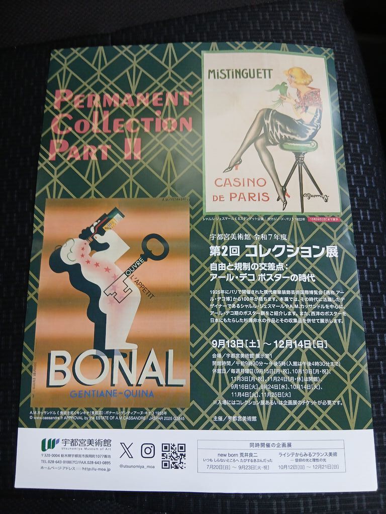 初めて宇都宮美術館に、見に来ました。駐車場から少し歩きますが、歩いていても、セミの鳴き声、カラスの鳴き声が聞こえ、歩いていても楽しかったです。今、第2回コレクション展が、9月13日から12月14日まで開催されています。アールデコ期のポスターが展示されていますが、デザイン、色使いと、本当にきれいだしすごいと思いました。また、10月12日から12月21日までライシテ展が、開催されます。どんな展示品かはわかりませんが、また楽しみです。 (訪問:2025/09/30)