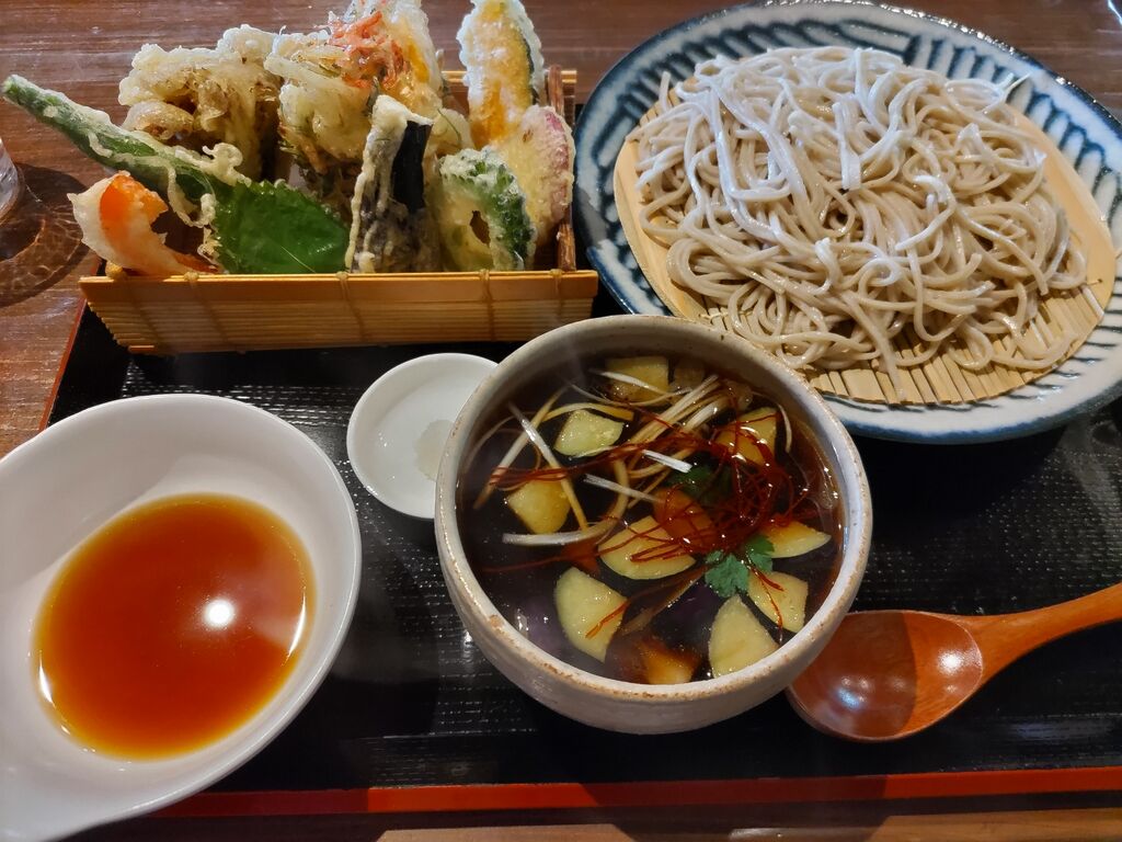 monmiyaの蕎麦特集に記載されていたお店に伺いました。こじんまりしたお店ですが、オシャレな感じです。季節天_栃木炙りしゃものつけ蕎麦セット(大盛り)を注文。1日8食限定でしたが、間に合いました。天ぷらは舞茸、かき揚げ、カボチャ、ナス、ゴーヤetcと具沢山です。しゃも付け汁には歯応えの良いしゃも、味付けも気に入りました。お蕎麦は喉越し良く暑い日にさっぱり美味し頂けました。蕎麦の盛り量は、大盛り、特盛り、メガ盛りまで有りました (訪問:2025/08/17)