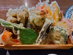 父親と行った最後の外食が里椛さんでした。あれから足が遠のいていましたが、約3年ぶりに行ってきました。入り口にあった写真のきのこつけ天ともりそばを注文しました。まずお通しでわさび漬けと水ようかんをいただきました。子どもにわさびは辛いからと嬉しい水ようかんとりんごジュースのサービスです。久しぶりにいただくおそばは香りが良くコシがしっかりしていてとても美味しかったです。きのこのつけ汁はきのこたっぷりで良く出汁が出ていました。天ぷらはどれも美しく宝箱の中身の様で、食べきれないほどたくさんの種類が盛られていました。父も里椛さんのおそばが好きだったので、久しぶりに伺えて良かったです。ご馳走様でした。 (訪問:2025/09/23)