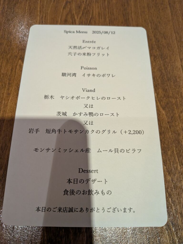 久しぶりに会うお友達とのディナーのため、気になっていたSpicaさんの半個室を予約しました。その日のお品書きがテーブルに用意されており、ワクワクが最高潮に!出てくるお料理は、味も見た目も工夫されており大満足でした。シェフも出ていらしてお料理の説明をしてくださり、楽しい時間を過ごすことができました。 (訪問:2025/09/13)
