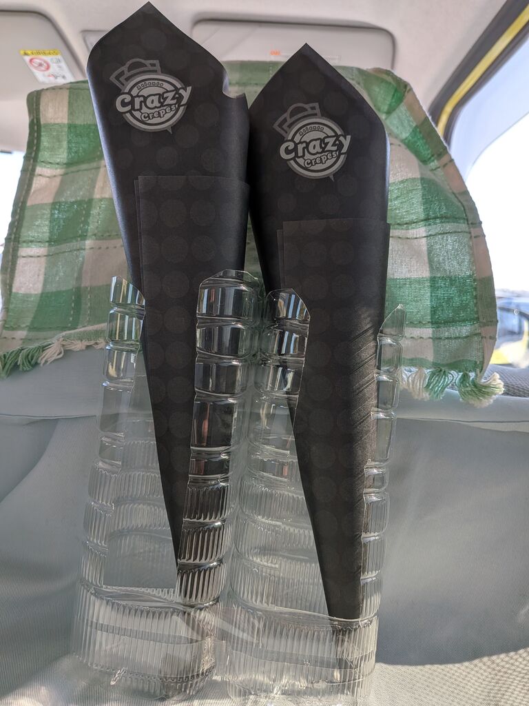 ホットシナモンバターシュガー・ホットアップルシナモンカスタードをいただきました。定番メニューにも惹かれますが、選んだのはやっぱ限定メニュー。テイクアウトのみなので、車の中で、いただきました。家までがまんできないので。生地がすごいしっとり柔らか。シュガーのしゃりしゃり食感とバターの風味がとっても美味。アップルカスタードは、カスタードたっぷり。アップルも加わるのでボリュームあります。激旨クレープ。このしっとり柔らか生地には、フルーツも、ホイップクリームも、アイスクリームも、チョコレートもきっとばっちり合うはず。定番メニューを食べるのが今から楽しみです。(Crazy Crepes 佐野プレミアムアウトレット店) (訪問:2025/11/07)