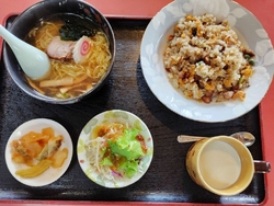 矢板でランチをしたことなかったなぁと思い、栃ナビを見て気になっていたお店に行ってきました。初めてのお店はちょっとドキドキしますが、13時頃に伺ったからか他にお客さんもいなく、店員さんが元気な挨拶で迎え入れてくれて、気持ちよく入れました。麺飯セットも気になりましたが、食べきれなさそうだったので、私は「海老かけごはん」の単品を、連れは「卵チャーハン+半ラーメン」のセットに追加で「餃子」を頂きました。“海老かけごはん”はプリプリの海老にタケノコや白菜のお野菜もシャキシャキでとっても美味しかったです。“餃子”は肉汁たっぷりのお肉がギューッと詰まっていて、手造りの皮はモチモチしていて厚さも絶妙でこちらもとっても美味しかったです。“卵チャーハン”にはチャーシューもたっぷり入っていて、デザート(杏仁プリンかな?)も美味しかったので、連れも大絶賛していました。会計時に栃ナビのクーポンを使わせてもらいました。提示する客が少ないのか店長さんの手を煩わせましたが、快く使わせていただきありがとうございました。店長さんも店員さんも気持ちのいい接客で、料理も美味しく他のメニューも食べてみたいです。矢板でのお気に入りのお店になりました。ごちそうさまでした(*'▽') (訪問:2025/09/19)