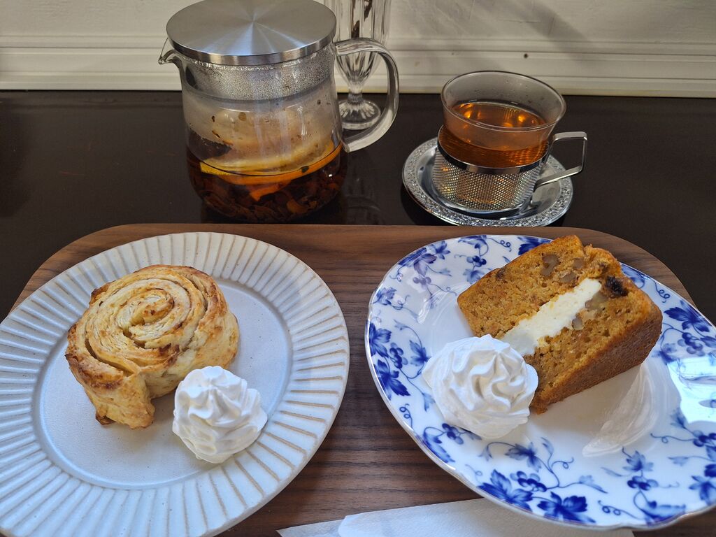 以前他店で購入したスコーンが美味しく、是非店舗にお邪魔したいと思い14時頃お邪魔しました。扉を空けると様々なスコーンがあり目移りしまくり。『ぐるぐるスコーン焼きたて(うめ)240円』『キャロットケーキ420円』『ドライフルーツティー280円(スイーツと一緒価格)』をイートインで、『ぐるぐるスコーン(りんご/レモン)280円』『うめコンポート500円』をテイクアウトで。スコーンの生地に素材を巻き込んだぐるぐるスコーン、新発売で梅があり、嬉しく即ゲット‼サックリした食感にたっぷりの梅ジャムが巻かれていて、どこをかじっても梅の香りとお味が満喫できて、梅好きにはたまらない爽やかな美味しさに感動でした☆合わせたドライフルーツティーもフルーツの香り豊かで美味しく、スパイス感たっぷりなキャロットケーキとも良い相性で、幸せなティータイムを満喫できました^^ドリンクはスイーツと一緒で半額になるというお得感もあり、是非またイートインも楽しみたいです!持ち帰ったレモンとアップルのスコーンもとても美味しく、パックされてるからか、こちらはしっとり食感に♪リンゴもレモンもたっぷり巻き込まれており、やっぱり美味しい‼ぐるぐるスコーン、絶品です。他のお味も楽しみたい‼梅のコンポート、なかなかよそでは出会いませんが、甘酸っぱいお味で、そのまま頂いてもヨーグルトに合わせても、お湯割りしても紅茶にいれても美味しかったです。 (訪問:2025/12/30)