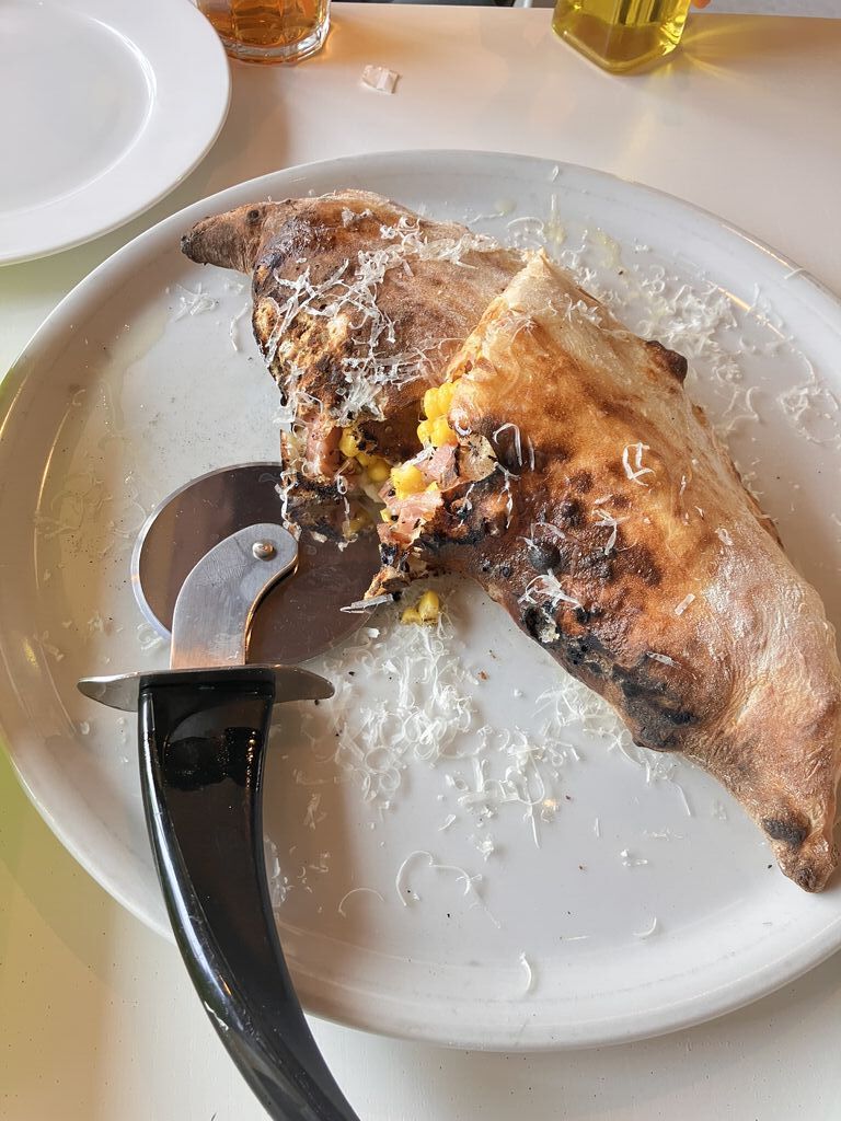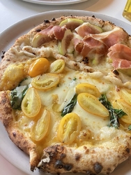 8月最後の日曜日。お昼ごはんをいただきに、神様と一緒に伺いました。たくさんあるメニューの中から迷いに迷い…今回は「モルタデッラ(イタリアハム)とピスタチオ、とうもろこしの包み焼きピッツァ1600円」と、ハーフ&ハーフで「いちじくと生ハムのチーズベースピッツァ&黄色のマルゲリータ“ジャッロ”1550円」をいただくことにしました。最初に運ばれてきたサラダのゴーヤをいただくと、思ったより苦くて夏の味を感じます。焼いたネギは、中がとろっとしていて甘い〜。そうこうしているうちに、ピッツァが登場。まずはハーフ&ハーフのいちじくと生ハムから。いちじくのピッツァは初体験。どきどきしながらいただくと、とろっとしたいちじくの甘さに、生ハムとチーズの塩味がベストマッチ!続いて黄色のマルゲリータ。甘酸っぱい黄色いトマトのジューシーなお味に、口にした途端に思わず「んーっ!」とうなっちゃいました。酸味が効いてて、さっぱりいただけちゃいます。後から運ばれてきた包み焼きピッツァは、まずはそのビジュアルにびっくり!迫力満点で、どうやって食べようかと神様と四苦八苦。結局、そのままかぶりつくことに。とろ〜りチーズとハムの塩っぱさ、とうもろこしの甘みにピスタチオの香ばしさ。あぁ、お酒が飲みたくなっちゃう美味しさ…。今回も、お腹も心も満たされる、素敵なランチを堪能できました。何度伺っても新しいお味に出会えるので、次回もはどんなピッツァに出会えるのか楽しみです。美味しい幸せをありがとうございました。ごちそうさまでした〜。 (訪問:2025/08/31)