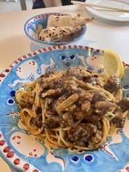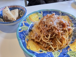 3連休の最終日。お昼ごはんをいただき、神様と一緒に伺いました。毎回新しいメニューがあるので、どれをいただこうか迷ってしまいます。悩んだ末に、今回は「シラスと青のりのピッツァ“ビアンケッティ”1600円」と「平田ロッソ牛すじ肉とタモギ茸のボロネーゼ風スパゲティ1500円」を注文。ほどなくしてサラダが運ばれてきました。さっぱりとしていてりんごの甘味を感じられるドレッシングに、きのこのマリネが美味しい~。キクイモ等、あまり食べたことのないお野菜もいただけるので、毎回サラダも楽しみのひとつです。続いてピザが運ばれてきました。びっしりと敷き詰められたシラスの量にびっくり。とろ~りチーズと青のり、シラスの相性は抜群!もっちもちの香ばしい生地も大好きです。そうこうしているうちにパスタも到着。モンテさんは、料理の提供が早いのも嬉しいです。パスタは「少し脂が多いので、レモンを絞って味変して食べてみてください」とのこと。お肉より、きのこや野菜の方がメインといっていいくらいたっぷり入っていて、旨味がぎゅぎゅっと濃縮されています。少しお腹が重くなってきた後半は、レモンを絞ってさっぱりいただきました。ん~、このレモンの爽やかさもよく合う~。最後まで美味しくいただけました。食後には紅茶をいただき、ほっとひと息。これだけの量でドリンクもついて、本当に良心的なお値段です。いつもお腹いっぱいになりすぎちゃうので、神様の胃腸の調子が良い時にしか伺えないのと、メニューの選択肢が多すぎるのが悩みの種ですかね…。美味しい幸せをありがとうございました。ごちそうさまでした~。 (訪問:2025/11/24)