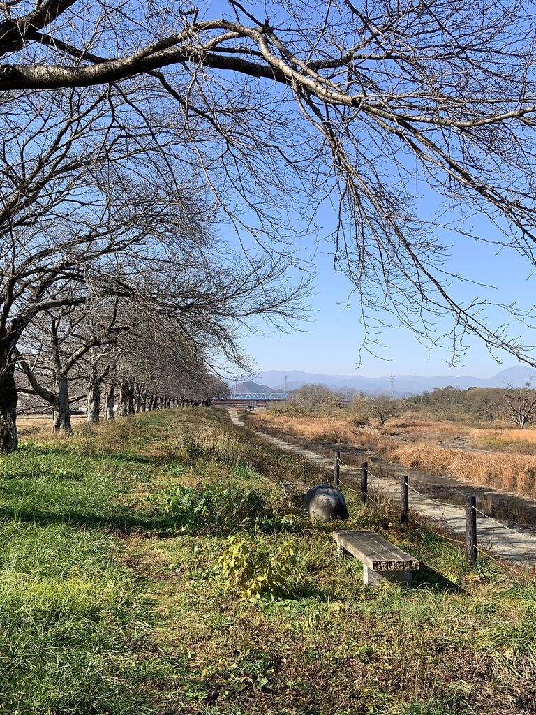 広場の北側を思川(小倉川)が流れています。駐車場入り口に、広場の名前の由来となった“小倉川の河童伝説”の内容が記載された説明板があります。下流側の河川敷には野球場があり、近くには東武日光線の鉄橋があります。堤防沿いには桜並木が続き、北西方向には日光連山を眺めることもできます。来年の春に再度訪れて、桜と電車・桜と山並みの写真を撮るつもりです。 (訪問:2025/12/01)