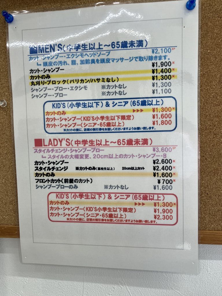 | カット(シニア65歳以上・小学生以下) | 1,300円 |