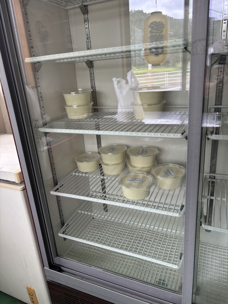 帰省する息子に美味しい豆腐を食べさせたくて、まだ残っていることを祈りながら訪問しました。サッシを開け、冷蔵庫を見ると豆腐があり思わずガッツポーズ。メモに名前と個数を記入し、缶にお金を入れて完了!保冷用の氷もあり暑い夏には助かります♪塩で食べるととっても美味しいですよ♪ (訪問:2025/07/30)