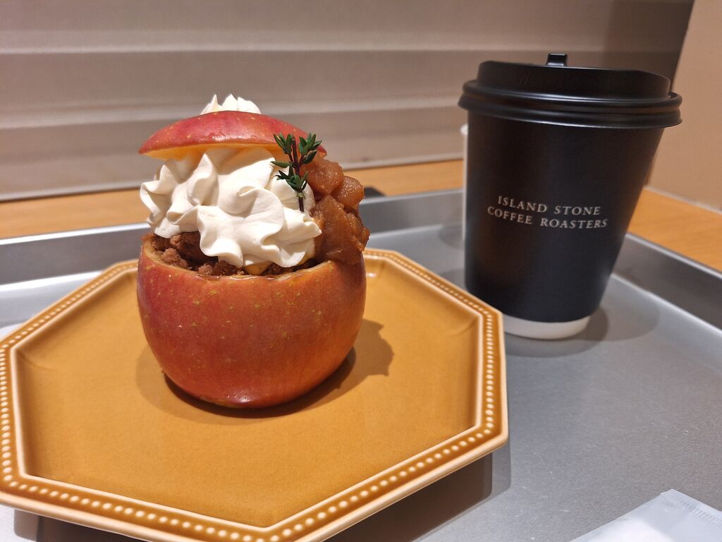 以前SNSで拝見していた『丸ごとりんご1273円』がずーっと気になっており18時前にダメもとでうかがってみたところ、ショーケースにどーんと鎮座‼本当にまるごとリンゴで、食べられるかしら?と不安になりつつ、『オーガニックアールグレイ550円』と共にオーダー。トレイに乗ったリンゴはずっしり重く、リンゴの爽やかな香りが際立ちテンションアップ。まずは蓋の部分をパクッ。うん、リンゴ。そこについていたクリームは生クリームだろうと思いきや、キャラメル生クリーム‼何とも芸が細かく、リンゴに合う‼その下には火を加えたリンゴにクランブルとカスタードクリーム、スポンジと外からはわからない様々な美味しさが詰まった魅惑のリンゴでした☆もちろん美味しいので、食べきれるか何て心配はなく、ペロリと完食^^紅茶ともすごーく相性がよく、リンゴもお茶も香りとお味とバランスよく、素敵な読書タイムを満喫することができました♪今こちらのショーケースはクリスマススイーツで溢れており、見た目も素敵でした! (訪問:2025/11/30)