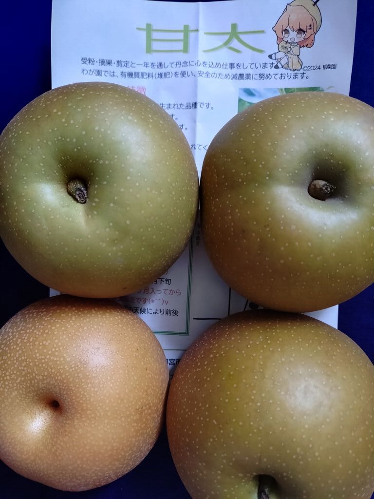 今回は珍しい品種の「甘太」を購入。大玉しか残ってなかったので大玉3個入を購入しました。おまけは最終の「豊水」を頂きました。甘太は王秋✕あきづきの交配で生まれた品種だそうです。スーパー等の店頭では見かけない品種の梨も柳梨園さんなら楽しめます。豊水は、もう終盤であきづきと甘太が販売されていました。酸味が少なく、名前の通り甘みのある多汁の梨でとても美味しかったです。 (訪問:2025/09/30)
