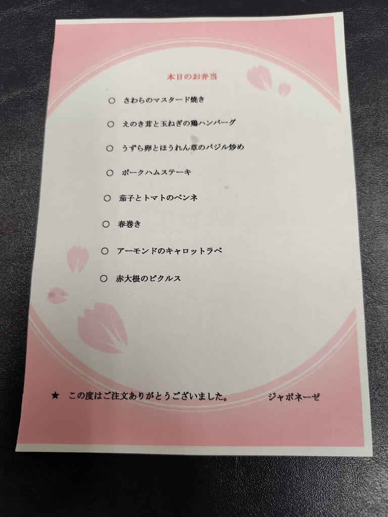 お店では何度か食事をしたことがありますが、テイクアウトのお弁当は初めてです。肉料理、魚料理の他に野菜がたくさん使われているのが嬉しいです。 (訪問:2024/03/07)