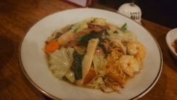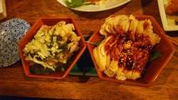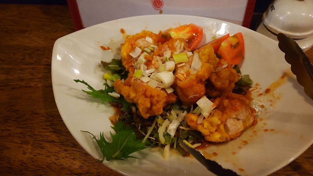 鶏レバーの醤油炒めハーフと、2種の前菜盛り(蒸し鶏の山椒ソースがけ・蒸し鶏のガーリックソースがけ)¥1250。香味たれのやみつき油淋鶏ハーフ¥1000は、ニンニクの効いた他のお店とは違った味でした。そして、皮を食べるパリパリ春巻き2本¥400は、本当にパリパリしてておいしかったです。青菜のピリ辛炒めハーフ¥800。チャーシューたっぷり黒炒飯ハーフ(スープ付き)¥800。葱油香るエビと野菜の塩味焼きそば¥1100。と、いっぱい頂きました。飲み放題1時間¥1500も付けて、お得なディナーになりました。 (訪問:2025/09/27)