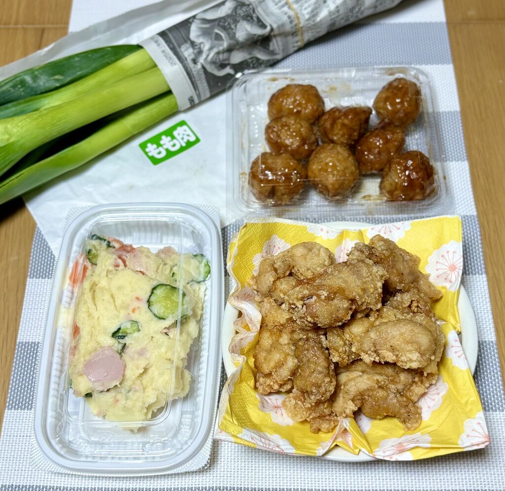 家人が電話注文のうえ購入してくれました。いつものむね肉ではなく、今日は骨なしもも肉のからあげとつくね(肉団子)、ポテトサラダに長葱です!どれも相変わらず美味しくてリーズナブルでありがたいお店です。 (訪問:2025/04/27)