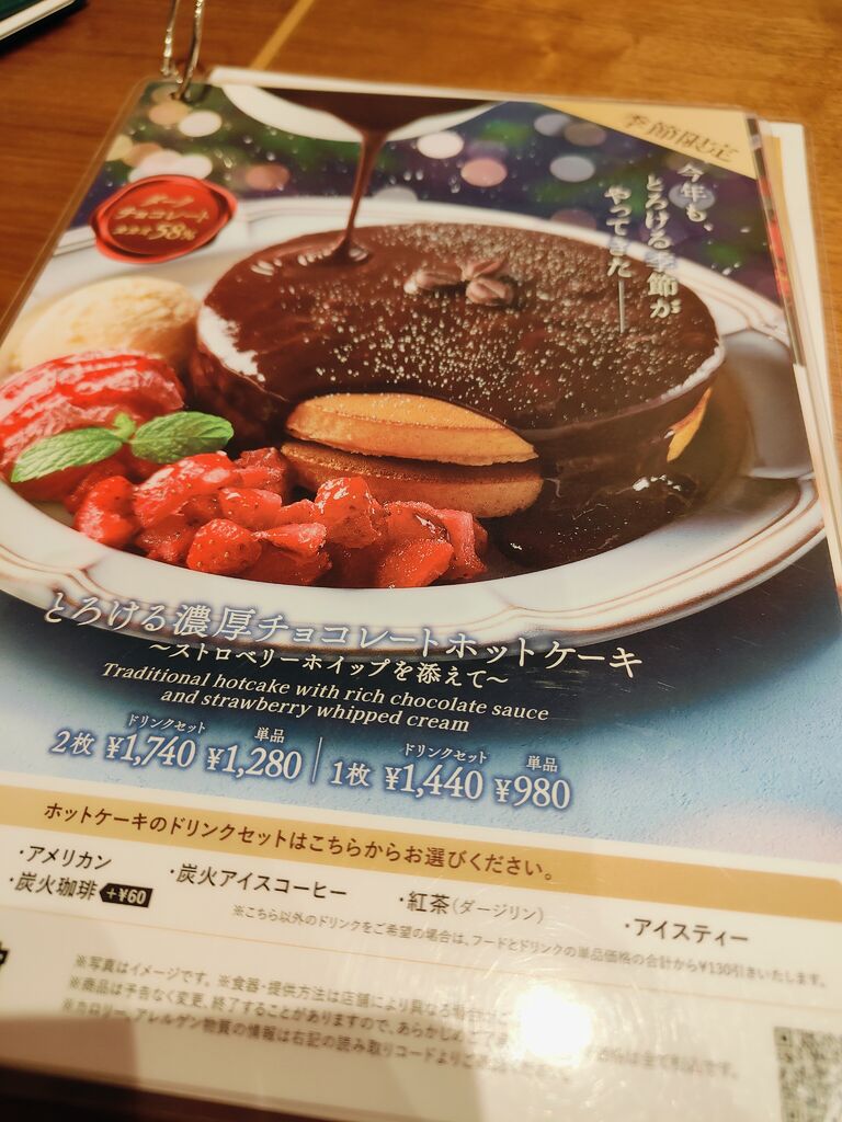デザートをいただきたく訪問です。今回は期間限定のチョコレートのホットケーキを注文です。2枚の注文をしましたがとても濃厚なチョコレートのソースでボリュームたっぷりでしたね。ホットの紅茶も風味が良く美味しくいただけました。 (訪問:2026/01/23)