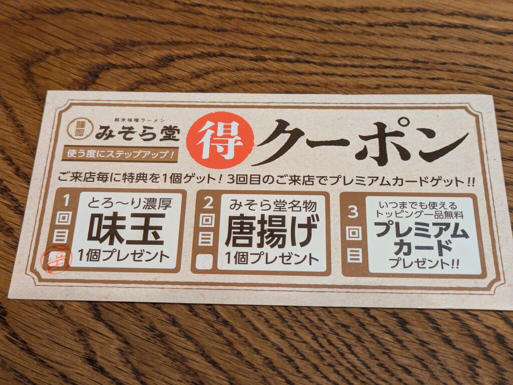 味噌ラーメンとは言え、様々なメニューがありました。伊勢海老ラーメンを狙ってたのですが、味噌豚骨が美味しそうでこちらにしました。笑店内が広くてテーブル席が充実していたのも嬉しいです。LINEでお友達になると味玉プレゼント、次回は唐揚げプレゼント、その後になると永久にトッピング無料券がもらえるそうです。お子様ラーメンにはおもちゃがついているようで、それもいいなと思いました。また行きます! (訪問:2026/01/12)