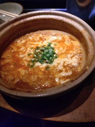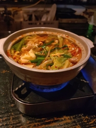またまた、富乃家で食事をしました。今回は、いただいた美味しいお料理について、お話をしたいと思います。いただいたお料理は、写真に掲載しました通り、新メニューのカレーベーコンポテトスティック、鉄人特製ナポリタン、鉄人特製肉汁爆裂餃子、旨辛もつ鍋、〆のチーズ雑炊になります。新メニューのカレーベーコンポテトスティックは、カレー風味の美味しいポテトスティックです。鉄人特製ナポリタンは、麺の食感とソースのハーモニーが何とも言えない美味しさです。鉄人特製肉汁爆裂餃子は、そのままでも美味しい餃子で、旨辛もつ鍋のスープに浸して食べると、尚、美味しいです。旨辛もつ鍋は、あいも変わらず美味しく、〆のチーズ雑炊も絶品です。その日も、お腹いっぱい美味しくいただきました。皆さんも、是非、食べてみてください。今回も読んでいただき、誠にありがとうございました。 (訪問:2025/10/04)