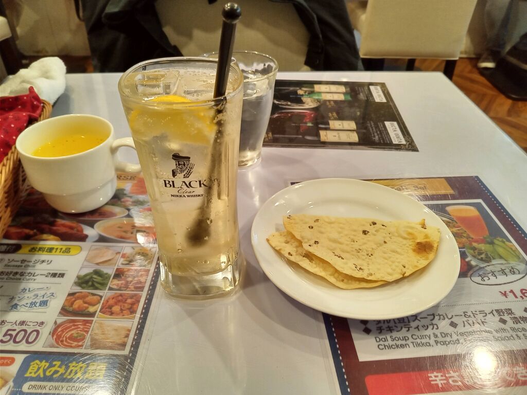 昼食を食べに行きました。天気が良かったので、歩いて行きましたので、少し汗が出るくらいで喉が渇いていました。メニューを今日の日替わりカレーはチキンと大根ということなのでそれにして、辛さは上から3番目の中辛にしました。飲み物は喉が渇いていたのでウイスキーハイボールにしました。時間が1時半をまわっていたことやお腹もすいていたし、とてもおいしいことや喉がかわいていたこともあって、ナンもハイボールもおかわりしました。大満足のLUNCHでした。また来る時がとても楽しみです✨ (訪問:2025/11/24)
