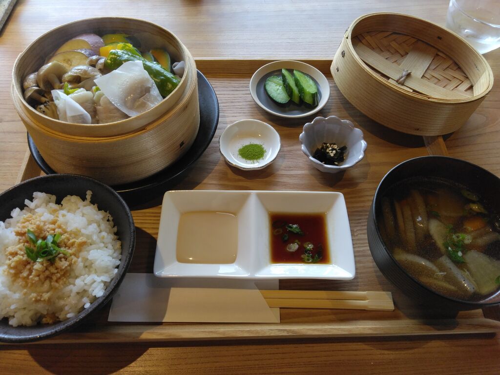 大谷散策をするのに前から気になっていたこちらのお店を予約して訪問しました。写真の看板が2カ所の曲がり角にあるのでわかります。駐車場も広々。写真で見た入口にテンションがあがり、重たいドアを横に開けて入店。2階の窓際のカウンターに座り、外の緑を眺めながらお料理を待ちます。注文したのは蒸しセイロと鶏そぼろご飯のセット。セイロの中は季節のお野菜。野菜の豚肉巻もあり、抹茶塩、ごまダレ、ポン酢などでいただきます。食後においしい煎茶をゆったり急須でいれていただきました。なかなかこの季節に温かいお茶をいただくことはなかったので、体に沁みました。ヘルシーな食事とロケーションに大満足。次はぜひティータイムに伺いたいです。 (訪問:2025/09/11)