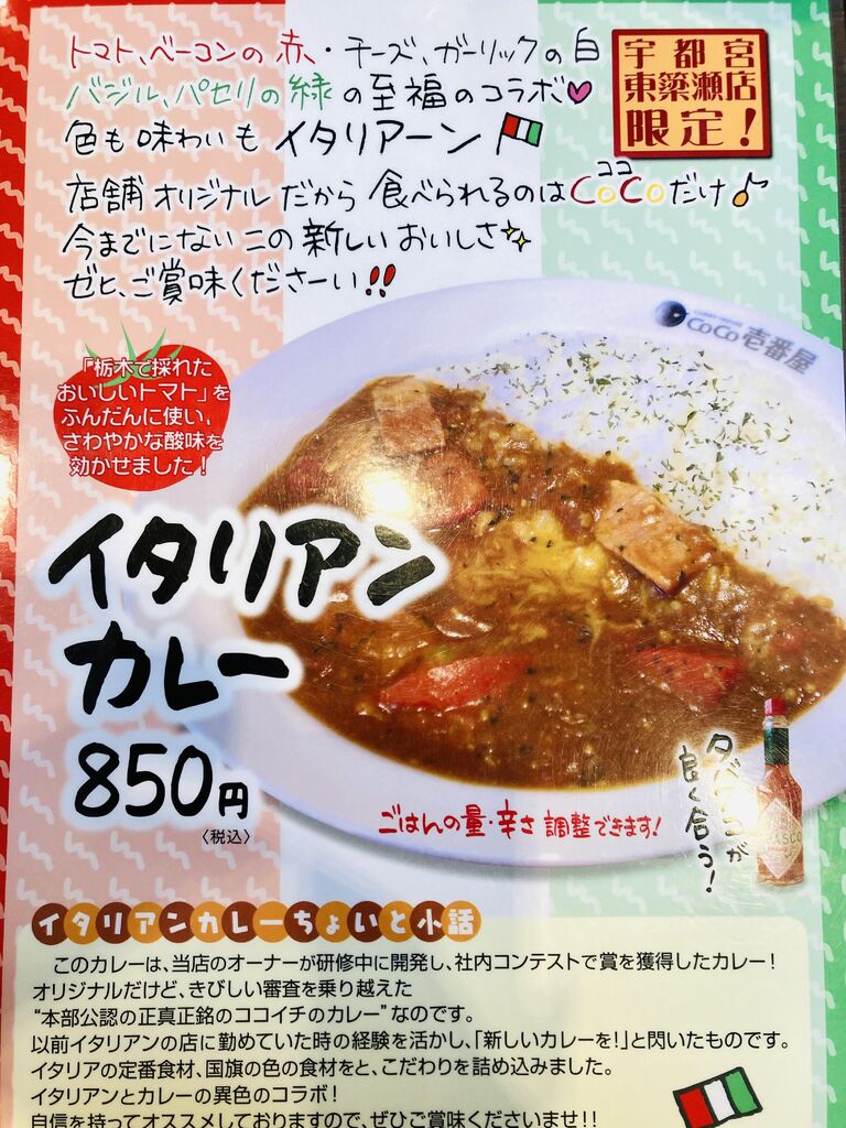 少し早めの夕方にCoCo壱番屋さんのイタリアンカレーを頂きに伺いました。この店舗限定なので、近くを通ると、ついつい足が向いてしまいます。ハンバーグもトッピングし、美味しく頂きました。お腹いっぱいになりました。ご馳走様でした。また来ます。 (訪問:2025/12/30)
