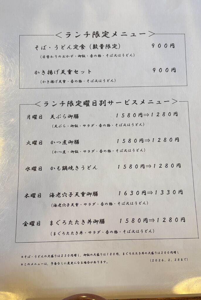NEW久しぶりにランチに訪問しました♪今日の日替り定食はホッケの塩焼き丼とそばかうどんのセットです♪悩んだ末に、かき揚げ重セットのそばにしました!そばはしっかりと冷たくコシがあり、かき揚げは桜エビの香りが良く刻んだ野菜がたくさん入っていてとっても美味しいです♪これで900円はコスパサイコーです!さらに曜日別のランチサービスメニューもあるのでこちらもボリュームたっぷりで美味しいですよ。注)曜日別ランチのメニューは定期的にシャッフルされるみたいです。 (訪問:2026/02/04)