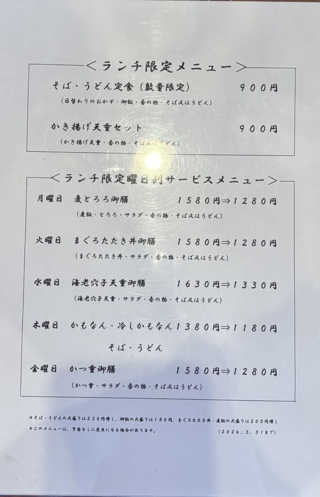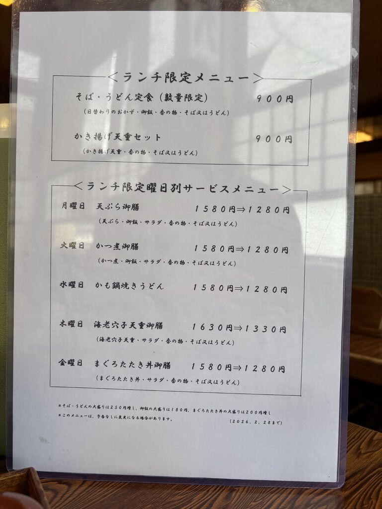 久しぶりにランチに訪問しました♪今日の日替り定食はホッケの塩焼き丼とそばかうどんのセットです♪悩んだ末に、かき揚げ重セットのそばにしました!そばはしっかりと冷たくコシがあり、かき揚げは桜エビの香りが良く刻んだ野菜がたくさん入っていてとっても美味しいです♪これで900円はコスパサイコーです!さらに曜日別のランチサービスメニューもあるのでこちらもボリュームたっぷりで美味しいですよ。注)曜日別ランチのメニューは定期的にシャッフルされるみたいです。 (訪問:2026/02/04)