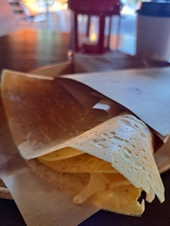 11月のLINEのドリンク付きお得なクレープ¥600(税込)『カスタードシュガー』は終了、代わりに『キャラメルシュガー』、ホットコーヒーはゲイシャを選びました クレープはまるで同敷地内のイチョウの葉と同じような色!(周囲を歩くとイチョウの葉の香りいっぱいします) イートインするにも 上着を羽織れば寒くなく、仕上がり待ち時間も癒しタイム♪ 先月、木製のプレートに提供されていて素敵!と思っていたら、今度は小さな灯りもテーブルに置かれていて、お・も・て・な・しの心が伝わります! 11月最終営業日になりましたが、伺うことができてよかったです!12月のユナイテッドガーデンでの営業日は少な目ですが、都合つけて、パリパリクレープと美味しいコーヒーをいただきに行きたいです (訪問:2025/11/29)