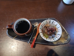 以前はあんみつセットを頂きましたが、今回はランチで来店しました。ランチメニューは1択のみ、おまかせプレート、コーヒーとミニあんみつが付いて1,480円でした。最初にお茶と小鉢(金時豆と南瓜の甘煮)お箸が運ばれ、次にプレート、ご飯が運ばれて来ました。どれも控えめな味付けで美味しかったです。食後にコーヒーとミニあんみつを頂きました。見た目は少なそうに見えますが、最後まで食べ進めるとお腹いっぱいになりました。 (訪問:2025/08/19)