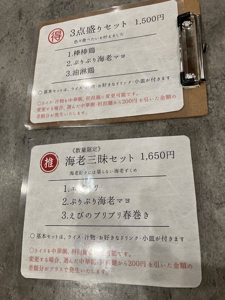 13時頃に到着しましたが、満席のようで一組待ち。受付を済ませて10分ほど待つと呼ばれたので店内へ。靴を脱いでスリッパに履き替えるスタイルはお洒落なカフェのよう。海老好きとしては、えび粥・海老三昧・エビチリ丼のどれにしようか迷っていましたが、限定メニューを発見して即決。私は限定の「アボカド中華がゆ~エビ・鶏入り」連れは「3点盛セット」を注文。モンブランも食べてみたくて「モンブラン食べ比べセット」も追加しました。“アボカド中華粥”は出汁のきいたお粥にアボカドが意外と合っていて体に染み渡る優しいお味。プリプリのエビと鶏肉も入っているので飽きない美味しさでした。しっかり味がついているのでそのままでも美味しいですが、ザーサイ・ネギ油・揚げ春巻きの皮で味変できるので色々な味が楽しめます。お粥なのでそこまでお腹は膨れないかなぁと思っていましたが、どんぶりにたっぷり入っているので結構お腹がいっぱいになります。“3点盛”は棒棒鶏・海老マヨ・油淋鶏の3点で、お肉は柔らかくて海老はプリプリで美味しい♪“モンブラン”はそれぞれ栗と抹茶の味が濃く、中のホイップは甘さ控えめで栗の味も引き立っていて絶妙な味わいでした。 (訪問:2025/10/30)