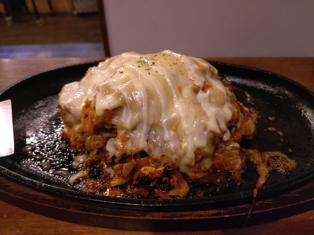 仕事帰りに、キッチン風熊に寄り、美味しいお好み焼きをいただきました。今回は、いただいた美味しいお好み焼きについて、お話をしたいと思います。いただいた美味しいお好み焼きは、写真に掲載しました通り、ブタキムチーズのお好み焼きです。豚肉が入ったキムチのお好み焼きにとろ〜りチーズがかかっています。ピリ辛でとても美味しく、チーズとの相性はバッチリです。また、野菜も美味しく、食が進みました。とても美味しいお好み焼きでした。皆さんも、是非、食べてみてください。今回も読んでいただき、誠にありがとうございました。 (訪問:2025/12/12)