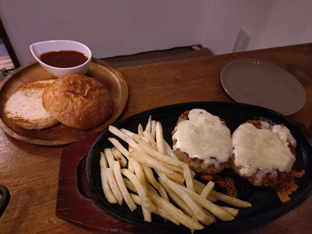 仕事帰りに、キッチン風熊にて、美味しいメニューをいただきました。今回は、いただいた美味しいメニューについて、お話をしたいと思います。いただいた美味しいメニューは、写真に掲載しました通り、チーズインオムライス、風熊特製ハンバーガーのダブルです。チーズインオムライスは、とろ〜りとしたチーズが加わったオムライスであり、特製ソースとの相性がバッチリな美味しいオムライスです。とても美味しく、食が進みました。ハンバーガーのダブルは風熊特製ソースで仕上げた肉厚のあるハンバーガーです。一緒のバンズも絶品です。とても有意義な食事でした。皆さんも、是非、食べてみてください。今回も読んでいただき、誠にありがとうございました。 (訪問:2025/10/24)