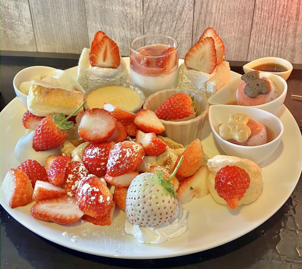苺メニューが盛りだくさん! 自社農園で採れたフレッシュな苺を贅沢に使用したメニューが充実!特に4品種の新鮮な苺を使った「4種味くらべ苺プレート」が大人気です。