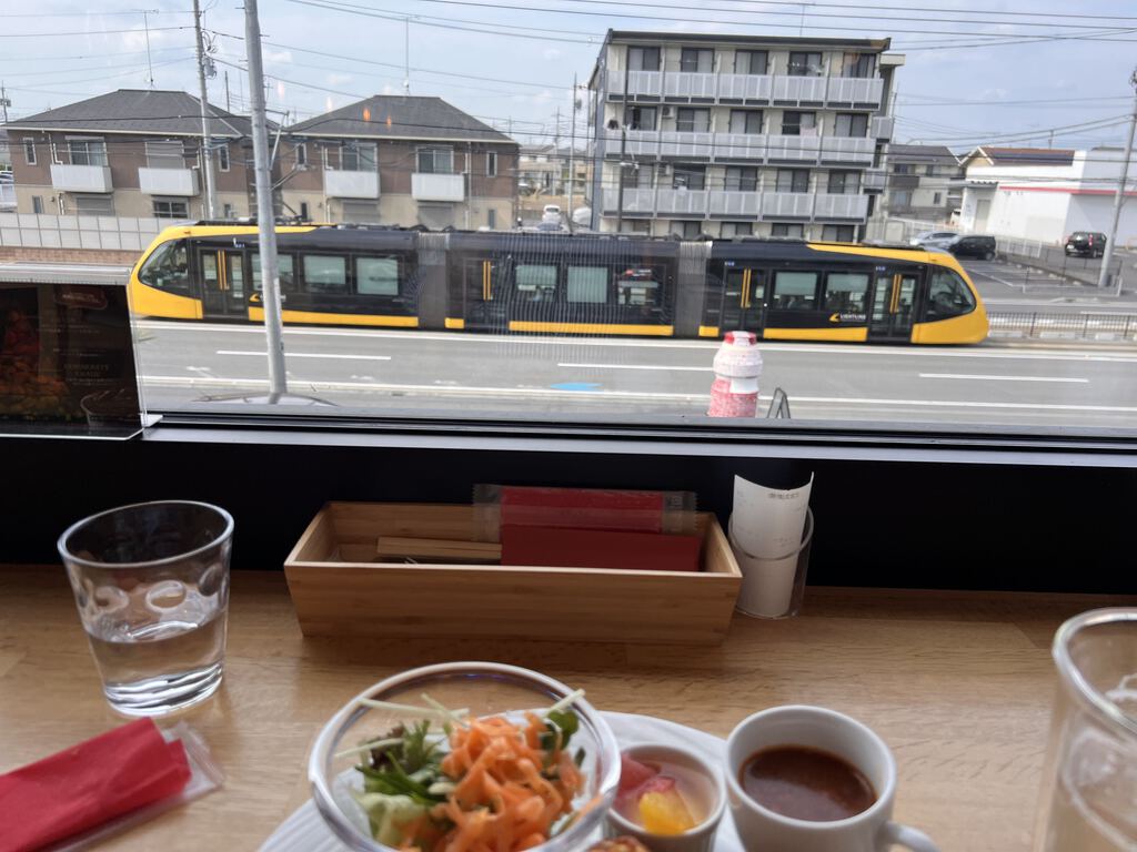 8歳の息子をかしの森公園に連れて行ったあと、ランチをしに寄りました。ランチメニューのナポリタン、サラダビュッフェ、スープ、ドリンクがついているものにしました。サラダビュッフェは色々ありすぎて、みーんな食べたくなります。ナポリタンは具だくさん、ボリュームたっぷりで、美味しいです。息子のリクエストで窓際の席に座りました。ライトラインがよく見えます。 (訪問:2025/04/19)