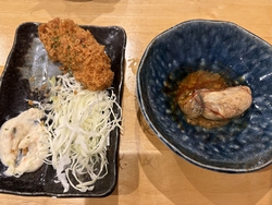 3回目の訪問です。牡蠣好きな人を見つけたらとりあえずこの店に勧誘することにしています。金曜日だったのでネットで予約しておきました!席だけ予約して、お店についてから色々選んで食べました❤︎オススメなのが生牡蠣の食べ比べ!今日はこれ!ってのを店員さんが説明してくれました(^^)産地が違うと、形も味も違いますね〜!そしてカンカン焼き(^^)大きなヤカン(のようなもの)で十分蒸された牡蠣をみんなで仲良くぱっかーんしていただきました!わたしは不器用すぎて手伝ってもらいました!カキフライや、いつもの柿の種も美味しく、いつも以上にたくさんお酒もいただきました(^^) (訪問:2025/09/05)
