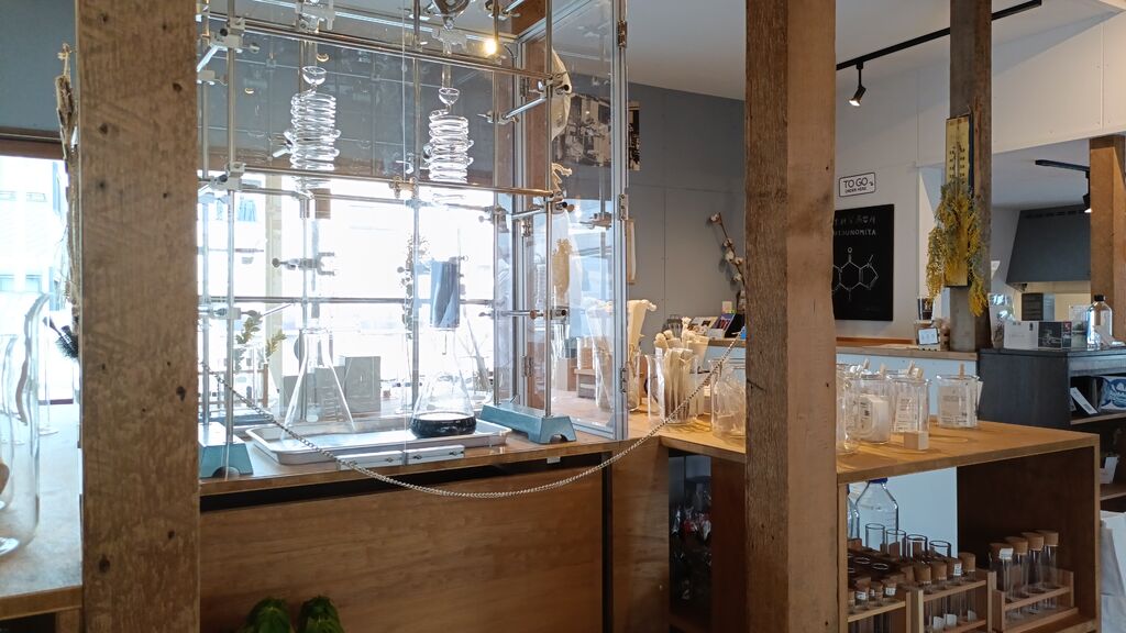 理科室蒸留所は理化学+インテリアの「リカシツ」から生まれた家庭用蒸留器「リカロマ」の展示販売とワークショップ、蒸留したドリンクと理化学機材でゆっくり抽出した珈琲を提供する専門店です♪