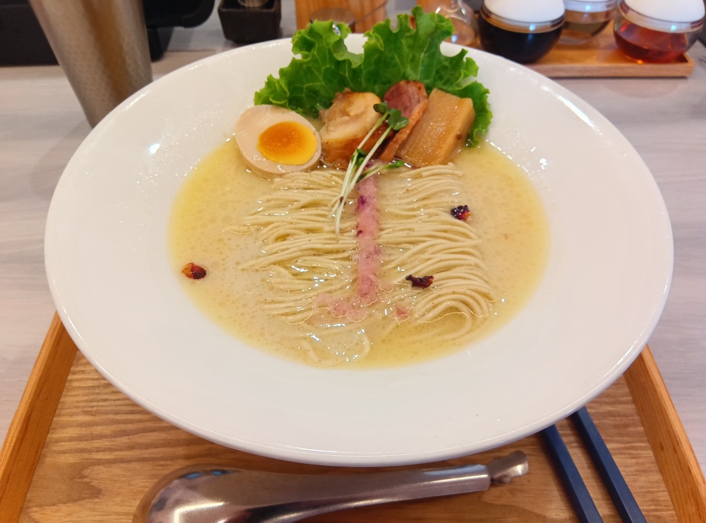 前回はつけ麺を食べたので、今回は鶏白麺(大盛り)と餃子を注文。ラーメンの麺は全粒粉細ストレートでパツッとした食感、スープは鶏の旨さのみ抽出したようなクリーミーなのにスッキリ甘みを感じる出来栄えです!トッピングは煮卵・鴨チャーシュー・ロース鶏チャーシュー・角切りシナチクでした。鴨は燻製した香りがしっかりしています。鶏チャーシューはしっとり食感、角切りシナチクはサックリ柔らかな口当たりで、トッピングの出来も良いです。餃子は焼き小龍包に近い感じですが、肉汁と餡の味わいが気に入りました。 (訪問:2025/09/24)