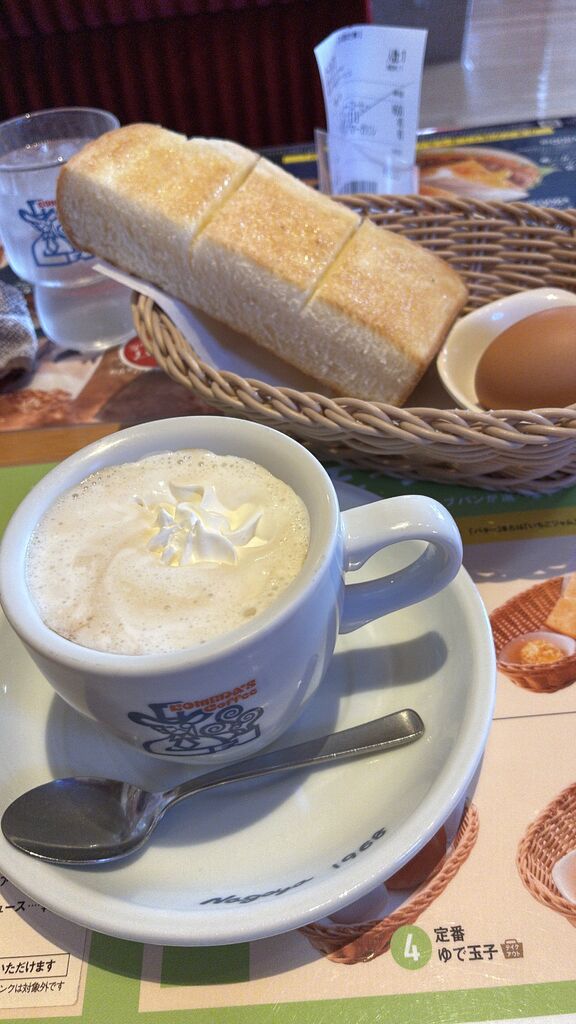 モーニング時間帯ギリギリの10:55入店。モバイルオーダーでコーンスープ、トースト、ゆで卵のモーニングとごちそうカスタードというケーキを注文しました。黒糖風味のスポンジとアーモンドの食感があり大好きなカスタードクリームたっぷりで美味しかったです。カップをあげると見えるイラストが可愛かった(笑) (訪問:2025/11/11)