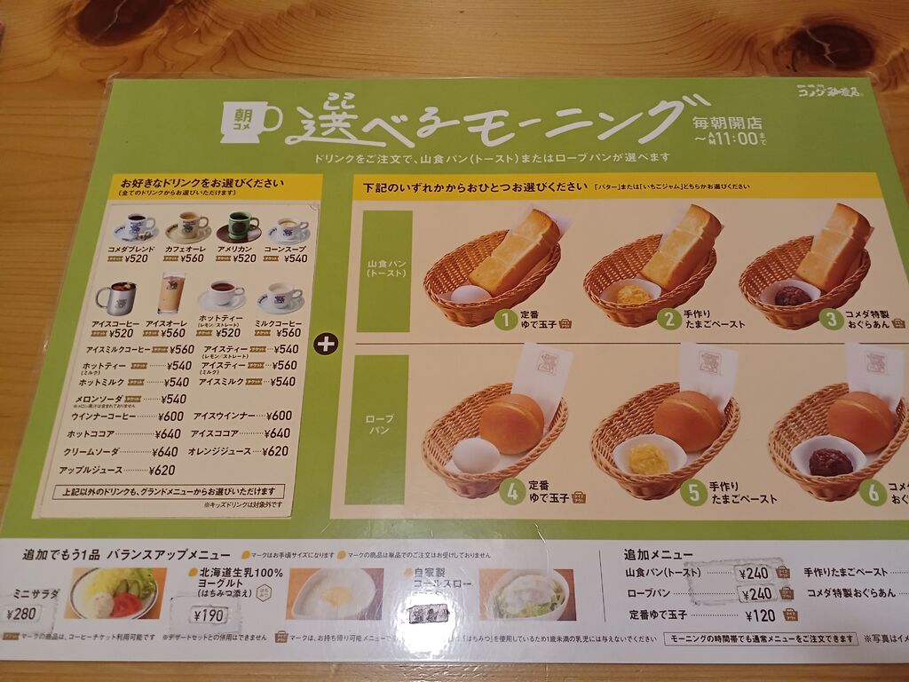 | ◇選べるモーニング(毎朝開店~11:00まで) | ドリンクをご注文で、ローブパンor山食パン(トースト)+定番ゆで玉子・手作りたまごペースト・コメダ特製おぐらあんのいずれか1つ無料 |