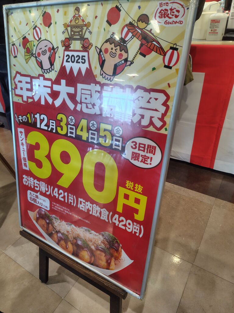 歳末大感謝祭 390円!!サンキュー価格で、大好きな【築地銀だこ】のたこ焼き〜♪並んでゲットしました(^^) 外カリッ、中トロッ、ハフハフしながらお口の中熱いけど、たこ焼き食べる時は、こうでなくっちゃね(笑)両親にもおすそ分けするので、2舟買いましたよ(๑´ڡ`๑) 諸説ありますが(!?)個人的には、からしマヨネーズが好きです(*^^*) 頑張ってたこ焼き焼いてくださった店員サン、ありがとうございます★並んで食べたたこ焼きの味は、格別やぁ〜(^^)vごちそうさまでした♡美味しく頂きました❢ (訪問:2025/12/05)