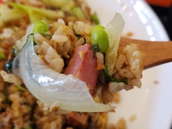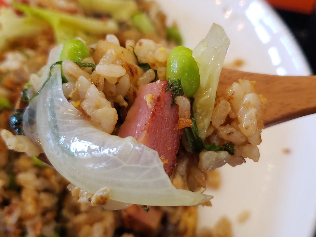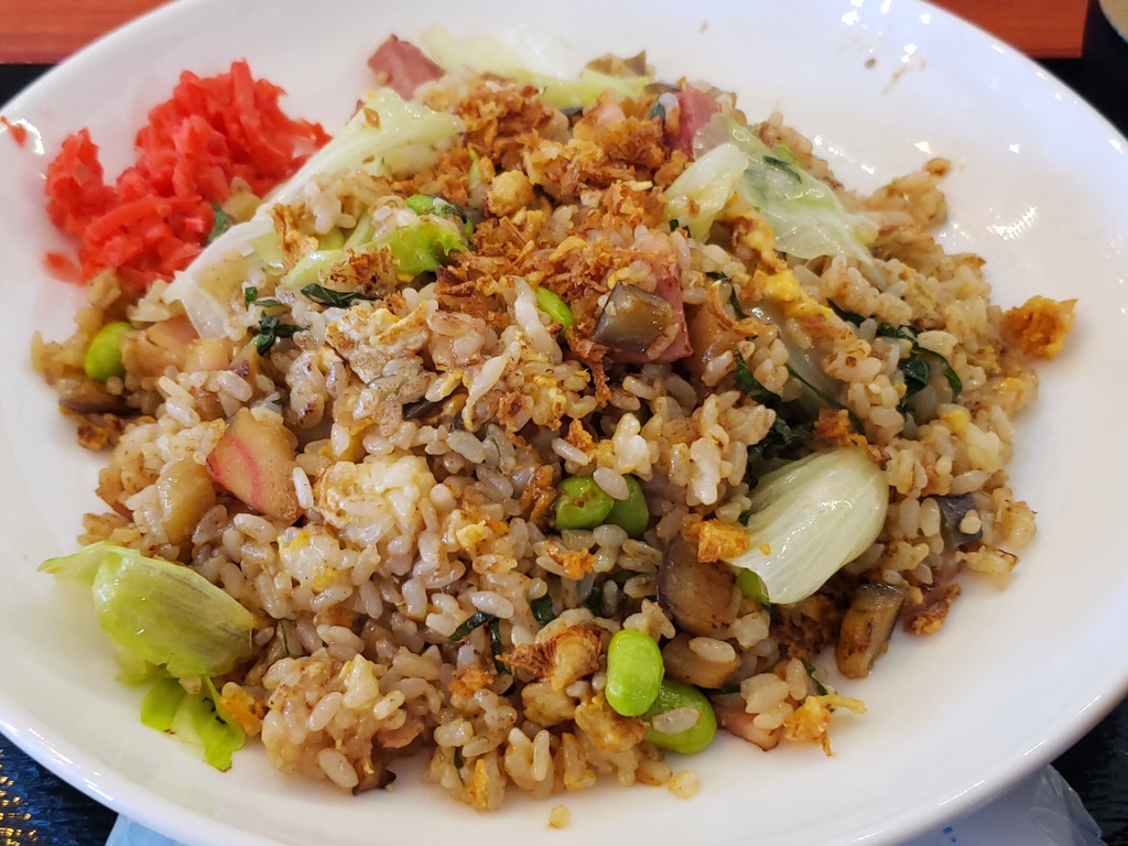 お昼をいただきました(^○^)本日の日替わり 量数限定 レタスチャーハンd=(^o^)=bレタスに茄子に枝豆、玉葱等、野菜たっぷりで、叉焼にナルトも入って、紅生姜もたっぷりで、うまかっぺよ✨( ^-^)ノ∠※。.:*:・'°☆ (訪問:2025/09/24)
