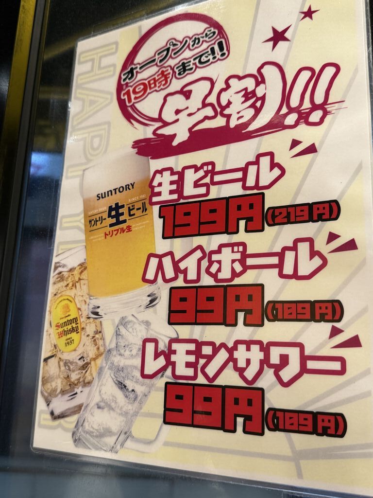 SNSで見かけて予約し初訪問させていただきました。予約必須の人気店です。開店から19:00まで嬉しい!ハイボール、レモンサワーが早割99円!厚切りの牛タン1人前、上ハラミタレハーフ、わさび醤油ハーフ ココロ刺し。ホルモンミックスを注文どれを食べても美味しいかったです。ハーフサイズが選べるのがとても良かったです。はじめてココロ刺しをいただきましたがクセも無く食感最高で美味しくいただきました。ごちそうさまでした♪ (訪問:2025/11/29)