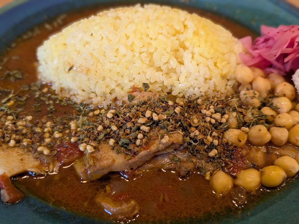 券売機でポークかチキンか選ぶシステム。さらに辛さ、ご飯の量などをオプションで選んで購入。チキンカレー中辛、ごはん大盛にしました。スープ状のカレーという大海に、サフランライスというビッグマウンテンがそびえ、麓には何種類あるのか不明のスパイスという灰が散りばめられ、離れて、カッテージチーズという氷河、玉ねぎの甘酢漬けという紫の風が青い皿に丁寧に収められていました。まずはカレーだけを味わいました。これだけですでにスパイシーで、鼻から抜ける辛さが家カレーとは全く違いました。次は散りばめられたスパイスたちとカレーを食べました。薬膳のような風味が加わると、根拠はありませんが体が喜ぶ味とでも言いましょうか。いよいよライスとの共演です。カレーとスパイスにコーティングされたライスが口の中でほどけていきました。サフランライスの甘さがカレーの辛さを際立たせていくのを感じました。砕けたスパイスの欠片たちが、口の中を駆け巡り、まだ知らなかった味の探求へ誘ってくれました。もっと知りたいと言わんばかりにカレーを運ぶスプーンが止まりませんでした。ひりひり感と辛さが増して、体のほてりを実感。カッテージチーズと食べると酸味が加味され、さわやかなスパイスカレーに変身。玉ねぎの甘酢漬けと食べると、まるでラッキョウとカレーのような関係性の疑似体験。ライスマウンテンをカレー海に沈ませ、一気に食べ切りました。ここで初めて水を飲み、口の中をクールダウンして退店しました。 (訪問:2026/01/25)