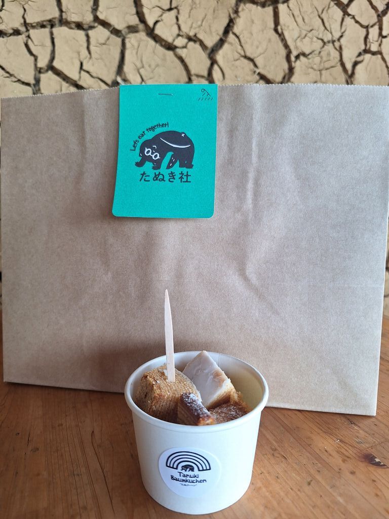 知人へのお土産に、お気に入りの『バウムクーヘン(しっとり)1700円』をゲットしました。しっとりとふんわりの2種類のバウムクーヘンがあり、どちらも食べた結果、私はしっとり派!米粉のほんのり甘味としっとり食感に加え、ラムが香るお味がたまりません‼今回差し上げた知人以外で食べたことのある県北の友人たちもしっとりうまい!と大絶賛しており、自信をもって知人にプレゼント!タヌキさんがブリッジしてるイラストの理由を説明した時点で、こういった意味のあるマークとうんちく好き‼と食べる前からお店の有り様に感銘を受けていました(タヌキさんのブリッジ理由はお店の方に聞いてみてくださいね)。食べた後には、あれは美味しい‼と大絶賛頂き、思わず、そーでしょ!うまいでしょ‼と鼻高々な気分^^自分の好きなものが贈った人に喜んで貰えるの嬉しいです。たぬき社さんに感謝です。今回は時間がなくてタヌジェラが食べられなく残念。是非またお邪魔します。 (訪問:2025/09/07)