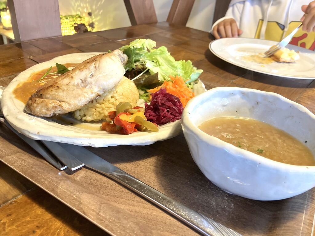 夕方から夜へと移り変わる頃に伺いました。窓に映るなんとも云えない美しいブルーを眺めながら身体に優しい夕食をいただきました。サムゲタンとジャガイモのグラタンのようなプレートをチョイス!アイスティーとアイスロイヤルミルクティーに新登場の抹茶ケーキ(取り置き)とチーズケーキは、テイクアウトしました。オニオンスープもジャガイモのグラタンも優しい味のサムゲタンもとっても美味しかったです♪連日行きたいくらい❣️身体に優しく沁み渡るんです!食材の素材そのものもいいんだと思います(^^) (訪問:2026/02/27)
