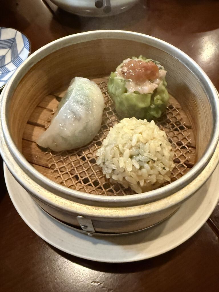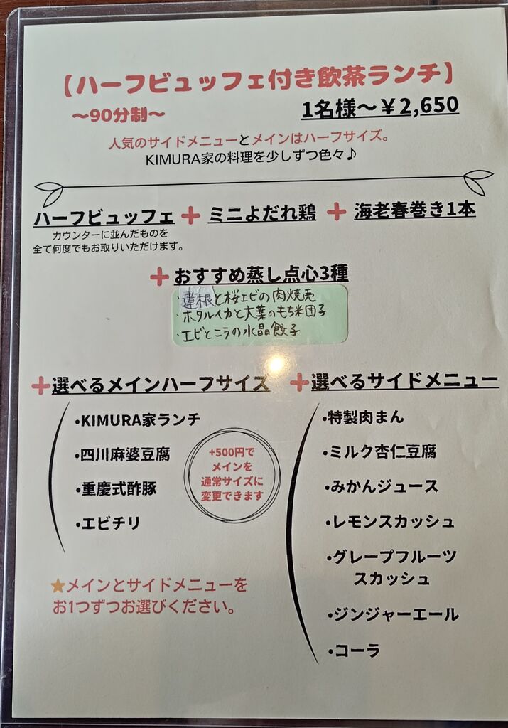 OPENしていた時からずっと気になっていたKIMURA家さん、ようやく伺う事が出来ました。開店に合わせて予約していましたが、入口には予約満席のお知らせが。ランチには単品セットもありましたが、点心を食べたかった私は飲茶ランチをオーダー。ランチには前菜サラダ、スープ、ライスビュッフェがついていますので、まずはそちらをテーブルへ。そのうちよだれ鶏、エビ春巻き、蒸したて点心、ハーフメインと次々テーブルへ。前菜は葉物サラダにかけたドレッシングが、他にはない青山椒を使った爽やかなドレッシングで満足。エビ春巻きはほとんどエビ?!ってくらいエビたっぷりで、冷めてもパリッパリ!3種の点心は、蓮根と桜えびの肉焼売、ホタルイカと大葉のもち米団子、エビとニラの水晶餃子とこちらも他では味わえない点心で大満足!メインの重慶式酢豚も餡が美味しく、杏仁豆腐もびっくりするほどの滑らかさと鼻に抜ける杏仁の香りも良く、全て美味しくいただきました。また是非お邪魔したい素敵なお店でした! (訪問:2026/04/23)