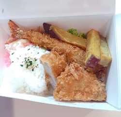 先日のヒレカツが美味しかったので、子供用のお弁当をテイクアウトしてみました。かわいい箱におかずがぎっしり!さつまいもスティックが渋くて素敵です。一つ一つのおかずが出来立てで、とても贅沢なお弁当でした。 (訪問:2025/08/29)