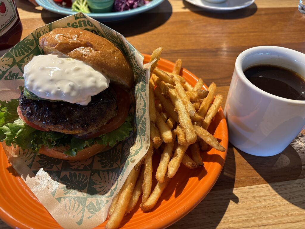 オープンしてから、いつも駐車場に多くの車がありましたので落ち着いてから行こうと思い待っていました(笑)それでも昼時に伺いましたので少し待ちましたが、ハワイアンなグッズも販売しているコーナーもあり、見ている間に呼ばれました。リゾート地にいるような雰囲気の店内は広くてリラックスできる空間でした。【コナズチーズバーガー】と【モチコチキン】飲み物は【クラフトレモネードソーダ】を注文。パティを覆い隠すようなチーズが印象的なチーズバーガーで食べ応えありました。自家製レモネードをソーダで割った爽快感のあるフラフトレモネードソーダもハンバーガーにピッタリです。モチコ・・・もち粉をまぶしてある唐揚げでカリカリで美味しかったです。パンケーキも人気のようで多くのお客さんが注文していました。次回はパンケーキを食べてみたい。 (訪問:2025/09/09)